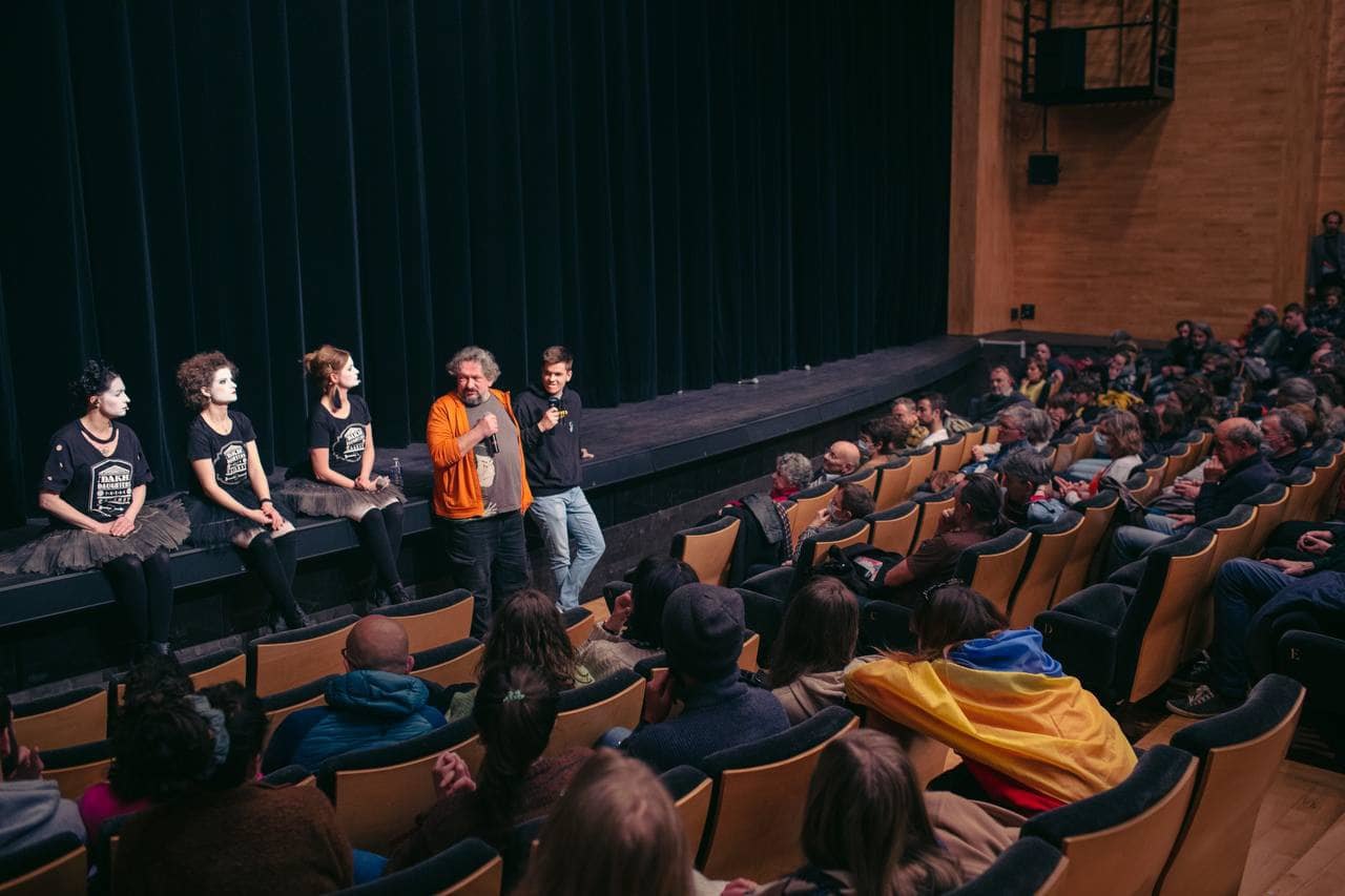 В Осло ми робили театральний фестиваль, як ми кажемо, «мікро-ГогольFest». Там був чи то перформанс, чи то гепенінг «Ніч у бомбосховищі». Увесь фестиваль час від часу переривався сиренами, і вся публіка мала спускатися в підвальне приміщення. У цьому підвальному приміщенні були каремати, матраси, пледики. Й ось нормальні норвежці, які прийшли на виставу, а опинилися в підвалі, спочатку сиділи, потім усвідомили, що незрозуміло, скільки ще сидіти і що робити, невідомо чого й невідомо скільки чекати. Вони почали вмощуватися зручніше, лягати. І тут залунав семиканальний звук, який розробила для нас молода композиторка: у цьому звуці одночасно і гул, і вибух, і плач дитини. Й артисти, норвезькі й наші, почали тихо читати щоденники з Маріуполя та Харкова. Вони читали так тихо, що ти місцями навіть не чуєш слів, лише шум. Аж раптом – молитва, українською, потім на їдиші й давньоарамейською. І в кінці, о шостій ранку, разом з усіма глядачами дівчата з Dakh Daughters вивчили українську пісню «Ой, у лузі червона калина», і заспівали хором у сховищі.